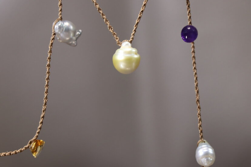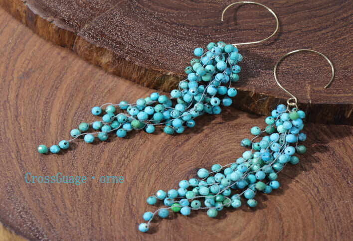 糸との組み合わせでさらに引き立てます。 すべて手作業で編み込み、ひとつひとつにこだわりと温もりが感じられます。 シンプルでありつつ、エセリアルな美しさと力強さと柔らかさを持ち合わせたデザインとなっています。 糸の色や編み込みのパターンによって、それぞれ異なる表情を持つアクセサリーに仕上げています。