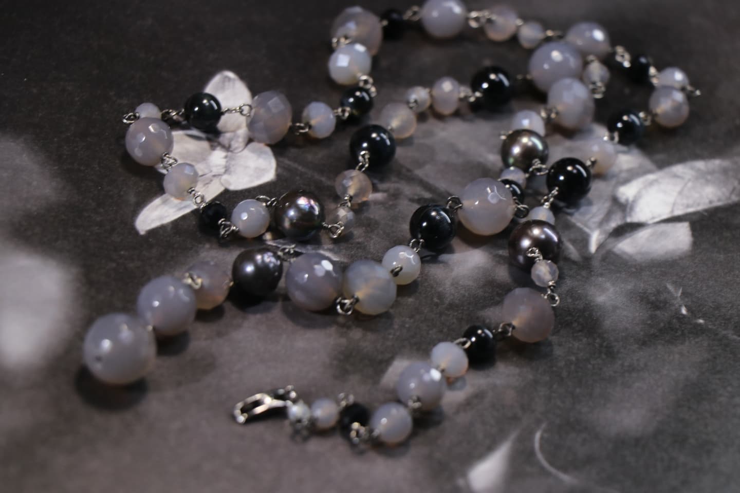 特徴: 燻し加工を施したシルバー925の美しい黒い輝きです。この加工により、シルバーが一層深みのある色合いを帯び、天然石やパールの輝きと相まって、独特のシックでミステリアスな印象を与えます。 エッジの効いたデザインは、シンプルながらも存在感があり、。特に、強さと優雅さが融合したスタイルを求める方におすすめのシリーズです。 また、シルバー925は耐久性にも優れており、燻し加工を施すことにより変色の心配もせず長く愛用いただけます。パールや天然石の組み合わせにより、華やかさと落ち着きが調和し重宝するアクセサリーとなっています。